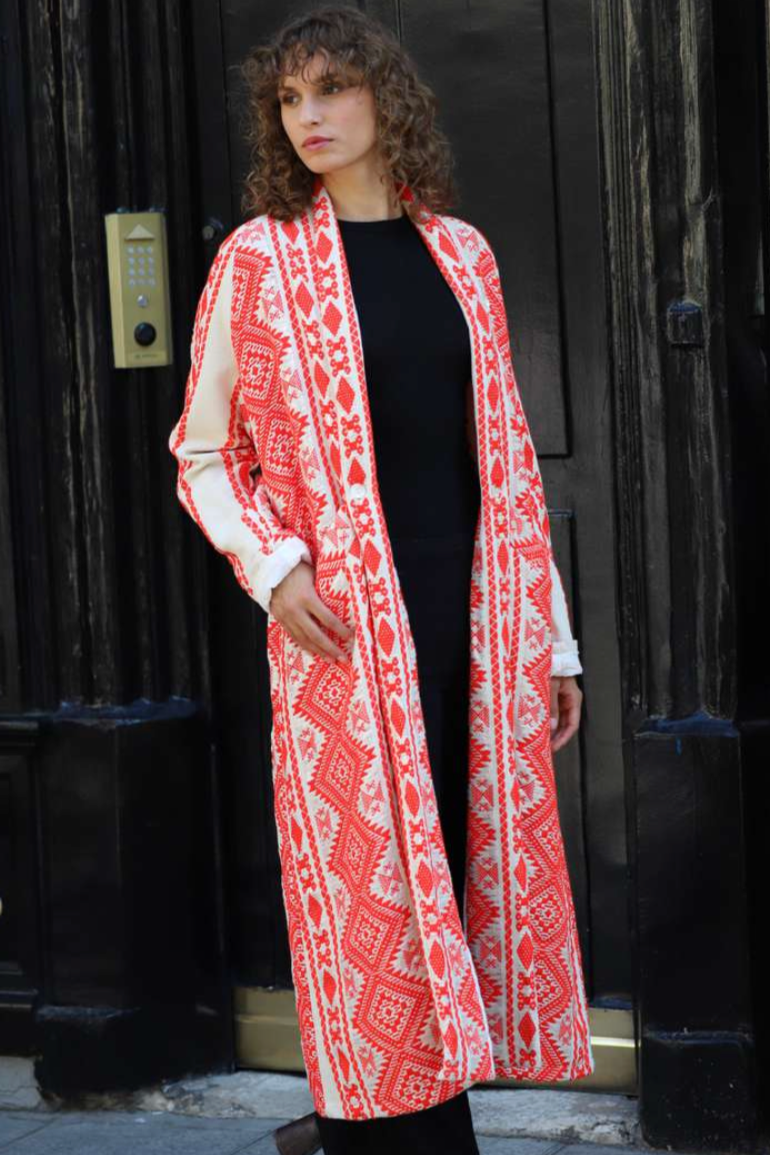 Craquez pour le manteau Bruxelles, une pièce unique en tissu jacquard 100 % coton. Ses motifs rouges et écrusapportent une touche de caractère à vos tenues tout en restant élégants et intemporels.